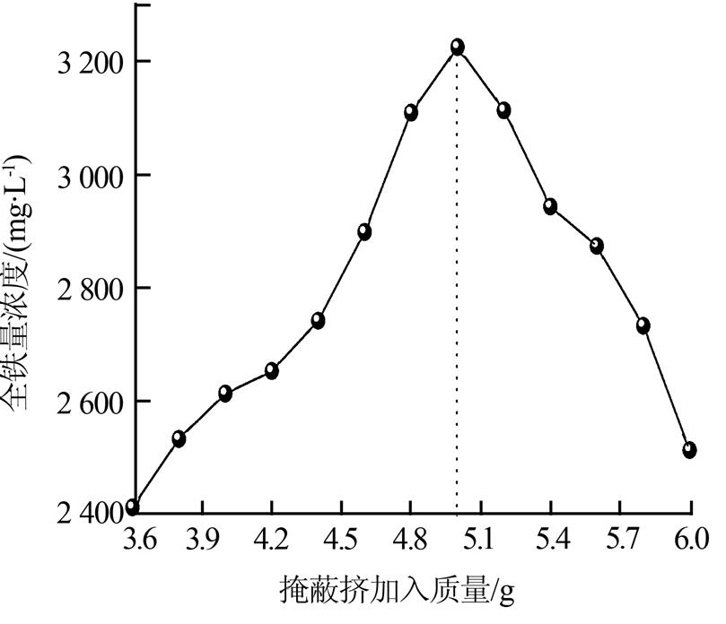 由圖 3可知,隨著掩蔽劑添加量的增加,全鐵測定質量濃度呈現先增后減的趨勢。掩蔽劑添加質量在3.6~5.0 g時,測定值呈上升趨勢,并在掩蔽劑添加質量為5.0 g時達最大值,隨后呈現總體下降趨勢。因此,廢液中Mg2+濃度較高,掩蔽劑添加質量宜選5.0 g。