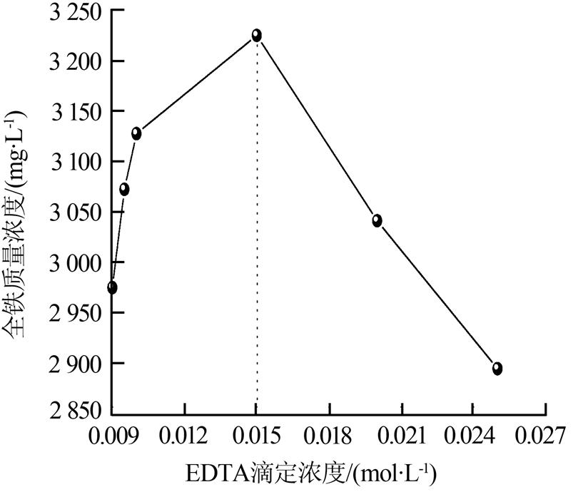由圖 4可以看出,EDTA濃度在0.009 0~0.015 0 mol/L范圍內,廢液中全鐵測定質量濃度隨滴定液濃度增加而迅速增加,并在0.015 0 mol/L時達到最大值,此后隨著滴定劑濃度的進一步增加,全鐵測定質量濃度逐漸下降。因此,EDTA滴定劑濃度宜選擇0.015 0 mol/L。