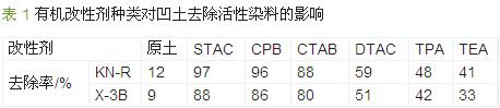 取STAC、CPB、CTAB、DTAC、TPA、TEA為有機改性劑制備的改性凹土(改性比均為8%)以及原土對KN-R、X-3B各自進行吸附,對比結果見表 1。