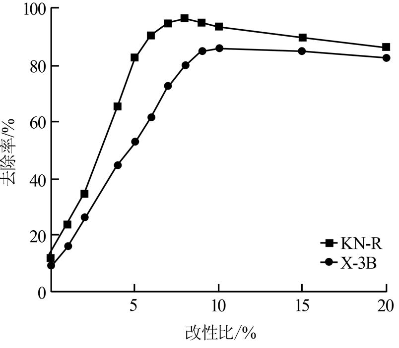 以CPB為優選有機改性劑,按不同m(CPB)∶m(原土)的改性比取不同用量的CPB對凹土進行改性。分別稱取0.1 g不同改性比的CPB改性凹土,按前述實驗方法計算恒溫振蕩60 min時CPB改性凹土對KN-R、X-3B的去除率。