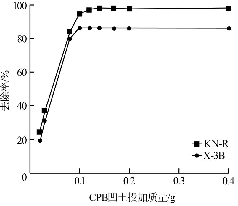 以9%為最優改性比,取不同量的CPB改性凹土,按前述實驗方法計算恒溫振蕩60 min時CPB改性凹土對KN-R、X-3B的去除率。調節活性染料溶液的pH,取0.1 g以9%CPB改性的CPB改性凹土,按前述實驗方法計算恒溫振蕩60 min時CPB改性凹土對KN-R、X-3B的去除率。