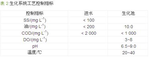 生化池設計:生化池材質選用PP板。PP板具有密度小、易焊接和加工,優(yōu)越的耐化性、耐熱性及耐沖擊性,無毒、無味,是目前最符合環(huán)保要求的工程塑料之一。其廣泛應用于耐酸堿設備、環(huán)保設備、廢水、廢氣排放設備的制作〔5, 6〕。生化系統(tǒng)工藝控制指標見表 2。