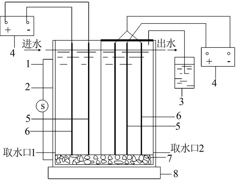 反應器為自主設計的雙層玻璃器皿,尺寸為D 140mm×1100mm,有效容積為12.3L,中間設一隔板將其均分為硝化區和反硝化區,底部連通。硝化區上端敞口構成好氧區,陽極和陰極各為1根碳棒;反硝化區上端用20 mm泡沫封好密封構成缺氧區,陽極為1根碳棒,陰極由4根碳棒并聯組成。碳棒的長度均為1 000 mm,浸水長度810 mm,碳棒的直徑11 mm,用0.5 cm厚的活性炭纖維(ACF)包裹。硝化和反硝化過渡區采用石英砂為填料(厚約75 cm),阻隔氧氣進入反硝化區,保證缺氧環境。取水口1取樣檢測pH、NO2--N、NO3--N,取水口2取樣檢測pH、NO2--N、NO3--N、氨氮。