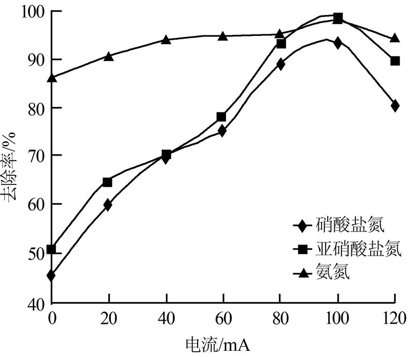 當控制溫度為35 ℃,氨氮質量濃度為400 mg/L,C/N為1,改變反硝化區的電流分別為0、20、40、60、80、100、120 mA,處理6 h后,考察電流對處理效果的影響,結果見圖 2。