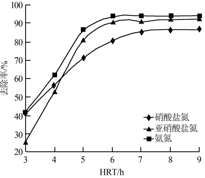 從圖 4可以看出,剛開始的幾個小時內氨氮和硝酸鹽氮的去除速率增長很快,而HRT=3 h時,亞硝酸鹽氮出現了積累,當HRT=6 h時,所有的測試項目的去除率均達到了90%以上,并且呈現隨HRT的增加,去除率增大。
