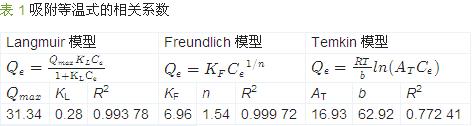 由表 1可知,淀粉/二氧化硅復合微球對鉛離子的吸附行為符合Langmuir模型和Freundlich模型,即淀粉/二氧化硅復合微球對鉛離子的吸附不僅存在單分子層吸附,還存在多分子層吸附。由于n<2,淀粉/二氧化硅復合微球對鉛離子的多分子層吸附存在阻力,其對鉛離子的吸附以單分子層吸附為主〔10, 11〕。