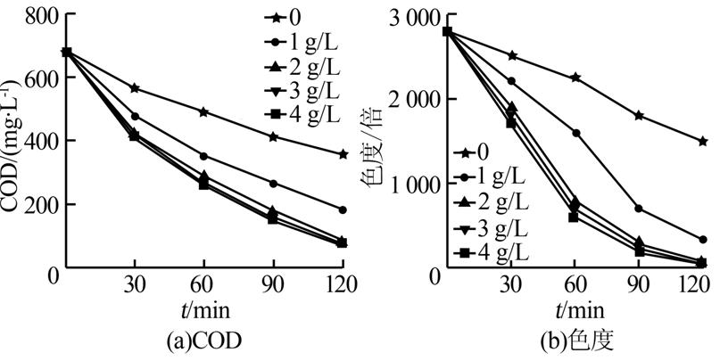 采用自制氧化錫電極,NaCl添加質(zhì)量濃度為2g/L,電流密度20mA/cm2,極距10mm以及pH=4的最優(yōu)條件下,電解120 min后COD去除率為87%,色度去除率為97%