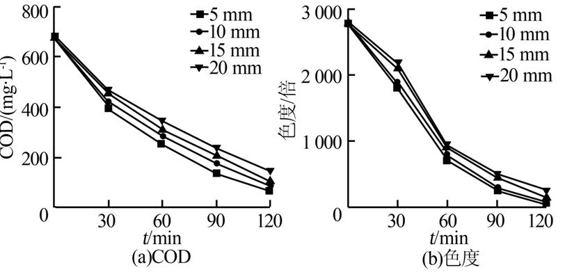 在相同條件下,極距越大,電流密度越小。使用自制氧化錫電極在NaCl添加質(zhì)量濃度為2 g/L,pH=4條件下,研究了極距對(duì)電解過(guò)程中COD及色度變化的影響,結(jié)果見(jiàn)圖 4。