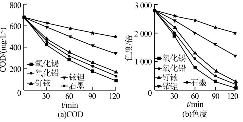 如圖 6(a)所示,電解過(guò)程中COD的降低速率對(duì)比結(jié)果為:自制氧化錫電極>氧化鉛電極>釕銥電極>銥鉭電極>石墨電極。如圖 6(b)所示,電解過(guò)程中色度的降低速率對(duì)比結(jié)果為:自制氧化錫電極>氧化鉛電極>釕銥電極>銥鉭電極>石墨電極。不同的電極具有不同的直接氧化和間接氧化的能力,氧化錫電極具有很高的析氧電位,以上實(shí)驗(yàn)表明自制氧化錫電極具有相對(duì)較高的電解效率。