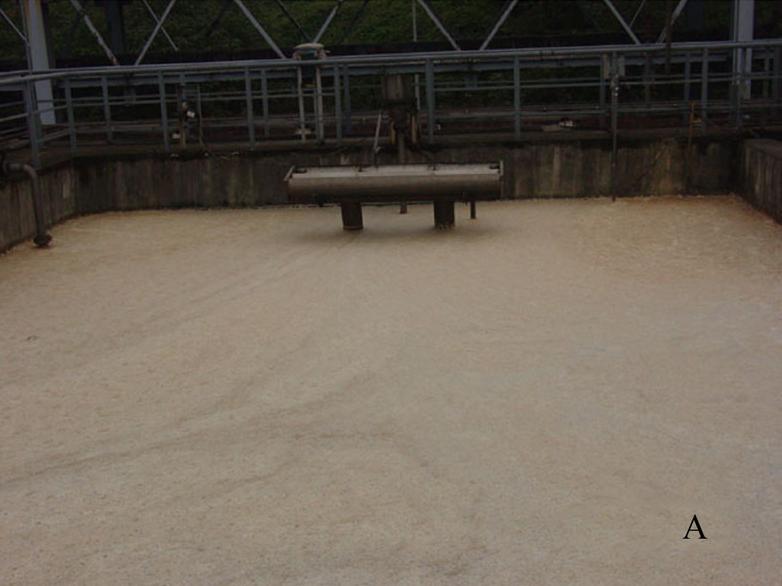 異常工況的初期,SBR池突然異常起泡,因起泡原因不明,誤認為是有表面活性劑進入污水系統造成,因此向SBR池內投加消泡劑進行消泡處理。但消泡劑只能短時間減少泡沫,并不能阻止泡沫的不斷產生。進入靜置階段后整個SBR池面布滿乳白色的泡沫,且打撈起的泡沫長時間不會自行破碎。SBR池的起泡情況如圖 2所示。