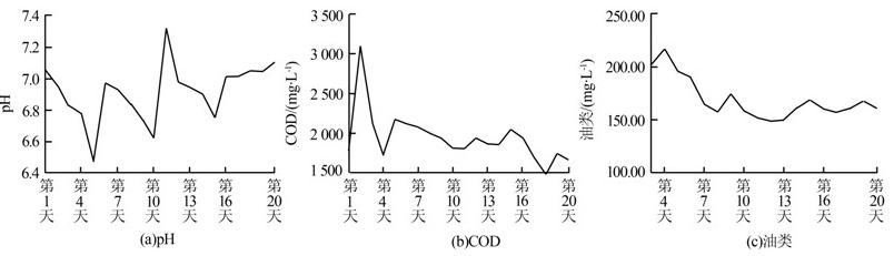 由圖 3(c)可知,調節池內的厭氧菌在受油類物質沖擊后,只在前7 d對油類物質有微弱的處理效果,之后油含量基本不再下降,說明調節池內的厭氧菌不能直接處理油類污染物。