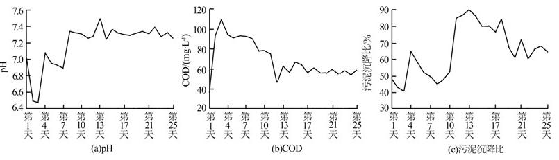 異常工況期間,初期停止SBR池進水,待逐步馴化后,逐漸增加進水量。異常工況下SBR池內pH、COD及污泥沉降比的變化趨勢如圖 4所示。