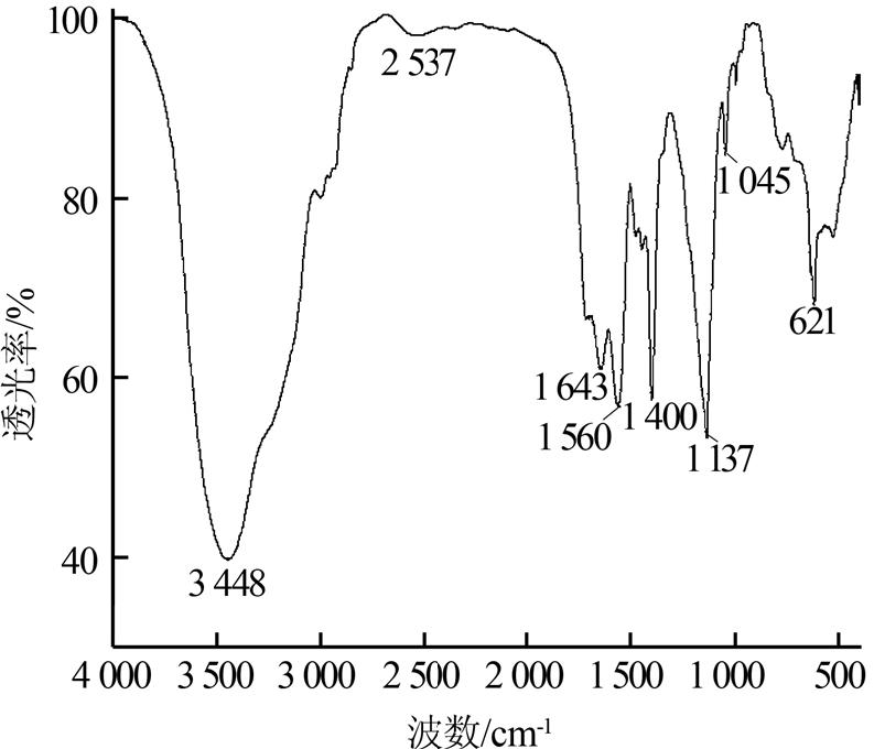 如圖 1 所示,在1 630 cm-1處C=C吸收峰的消失說明單體充分地參加了共聚反應;621 cm-1處為—C—S的伸縮振動吸收峰,1 045 cm-1處為磺酸基團中—S=O的不對稱伸縮振動吸收峰,說明共聚物分子鏈上含有磺酸基團;1 400 cm-1處為羧基中—C—O的伸縮振動吸收峰,2 537 cm-1處為羧基中—OH的伸縮振動吸收峰,證明共聚物分子鏈上含有羧酸基團;3 448 cm-1處為酰胺基中—NH的伸縮振動吸收峰,1 643 cm-1處為酰胺基中—C=O的伸縮振動吸收峰,證明共聚物分子鏈上含有酰胺基團;1 560 cm-1處為酯基中—C=O的伸縮振動吸收峰,1 137 cm-1處為酯基中—C—O的伸縮振動吸收峰,說明共聚物分子鏈上含有酯基。從紅外光譜圖的分析可知,共聚物分子中含有羧基、酰胺基、酯基和磺酸基官能團,符合實驗設計。