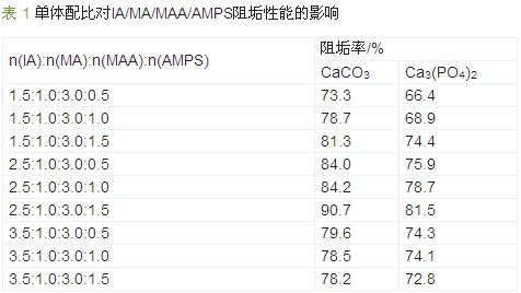 由表 1可知,在單體配比n(IA)∶n(MA)∶n(MAA)∶n(AMPS)=2.5∶1.0∶3.0∶1.5時,共聚物的阻垢效果最好,對碳酸鈣的阻垢率為90.7%,對磷酸鈣的阻垢率為81.5%。