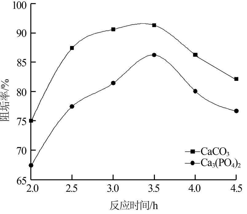 如圖 2所示,共聚物的阻垢性能隨著反應時間的增加而增大,當反應時間為3.5 h時,共聚物對碳酸鈣和磷酸鈣的阻垢率均達到最大,之后隨著反應時間的增加,共聚物的阻垢性能呈現下降趨勢。對于共聚物自由基反應,反應時間影響著聚合反應的完成度,隨著反應時間的延長,聚合反應的完成度越高,共聚物的阻垢性能越好。但是反應時間過長,會使得聚合物的相對分子質量過大,從而導致共聚物的阻垢性能降低。