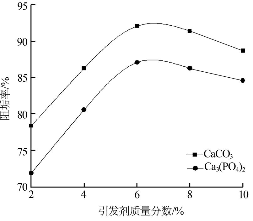 由圖 3可知,當引發劑質量分數為6%時,共聚物的阻垢性能最佳。引發劑的用量越大,共聚物的相對分子質量就會越小,共聚物阻垢性能越好。但當引發劑用量過大時,生成的單體自由基增多,鏈終止速率隨之增大,反應完成度降低,導致共聚物的相對分子質量過小,從而影響共聚物的阻垢性能。