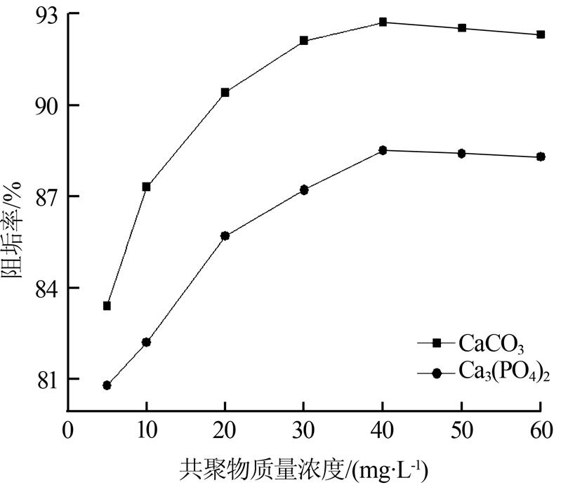 考察了IA/MA/MAA/AMPS四元共聚物在不同的投加質量濃度下對碳酸鈣和磷酸鈣的阻垢性能的影響,結果見圖 4。由圖 4可知,共聚物的阻垢率隨著其投加質量濃度的增加而增大,當共聚物投加質量濃度大于40 mg/L時,其對碳酸鈣和磷酸鈣的阻垢率均有略微的下降,因為共聚物的加入量過多時,分子鏈上各官能團會因強烈的極性作用而發生凝聚,從而導致阻垢性能略微下降。