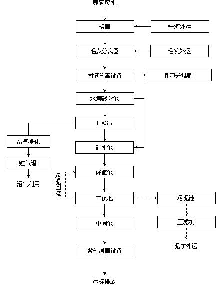 污水寶基于以上原因,針對養(yǎng)狗廢水的特點,并參考國內多數(shù)養(yǎng)殖場的廢水處理站,設計的處理工藝為: