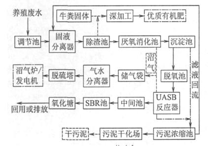 牛舍中固體廢渣被送入固體發酵池儲存和發酵,滲濾液導入調節池。調節池出水泵入固液分離機,粗纖維被分離;再自流入仿溶氣氣浮池設計的除渣池,較輕無機物被除去,減輕了發酵池負荷,提高發酵空間利用率,減少沉渣清理頻率;然后自流入厭氧消化池,兼性菌和厭氧菌不斷降解有機物,還產生沼氣。其出水所帶浮渣在沉淀池去除;上清液自流進入脫氧池,并泵入UASB池,可去除大量可溶性有機物,產生沼氣,且能殺滅病菌。再自流進入中間池。此后好氧部分采用SBR池,好氧、兼性微生物分解有機物,可脫氮除磷,其出水BOD/COD>0.3,可利用現有池塘作生物氧化塘進一步凈化。沉淀池、UASB反應池的污泥以及中間池污泥收集泵入污泥濃縮池,然后進入污泥干化場脫水,風干后的污泥與晾曬后的牛糞用于墊牛舍。厭氧消化池與UASB反應器產生的沼氣導入紅泥塑儲氣袋,經脫水、脫硫處理后用于燒沼氣鍋爐或發電。