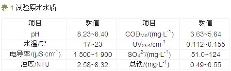 試驗原水取自天津工業大學鏡湖水,水質見表 1。