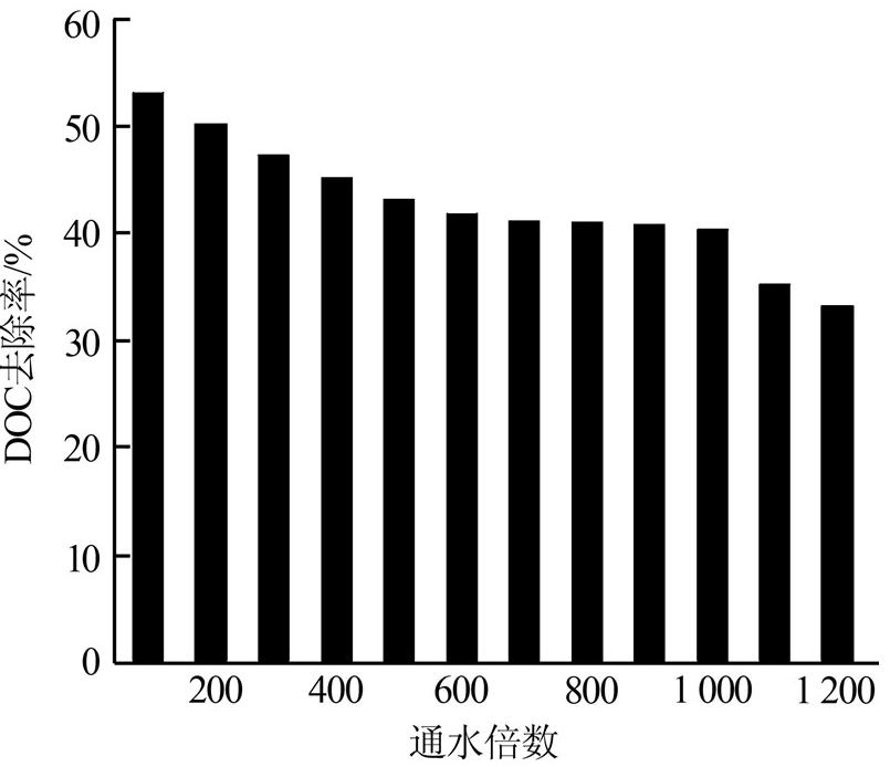 從圖 2可以看出,當通水倍數為100 BV時,MIEX®對DOC的去除率為53.17%。隨著通水倍數的增加,DOC去除率逐漸下降,通水倍數達到400 BV之后,DOC去除率快速下降至45.23%,此后去除率變化速率明顯趨緩,直至通水倍數達到1 000 BV,DOC去除率始終能夠穩定在40%以上。當通水倍數增至1 100 BV時,DOC去除率突然下降至35%。這是因為一定量的MIEX®僅含有有限的離子交換位點,隨著通水倍數的增加,MIEX®表面的交換位點逐漸被DOC分子所占據。當通水倍數達到1 100 BV時,DOC去除率急劇下降,這表明此時MIEX®已不能維持穩定的去除效果,因此確定通水倍數達到1 000 BV時對MIEX®進行再生。