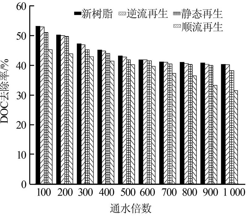 根據再生周期試驗結果,取60 mL新鮮樹脂進行連續1 000 BV通水倍數的多批次吸附處理,然后將樹脂分為3等分分別進行靜態攪拌再生、動態順流再生和動態逆流再生。其中再生液均為10%NaCl溶液,再生液體積為200 mL,順流再生與逆流再生的再生液流量為10 mL/min。經3種再生方式處理后的樹脂重新進行通水倍數試驗,以考察不同再生方式對再生樹脂去除有機物性能的影響,結果見圖 3。