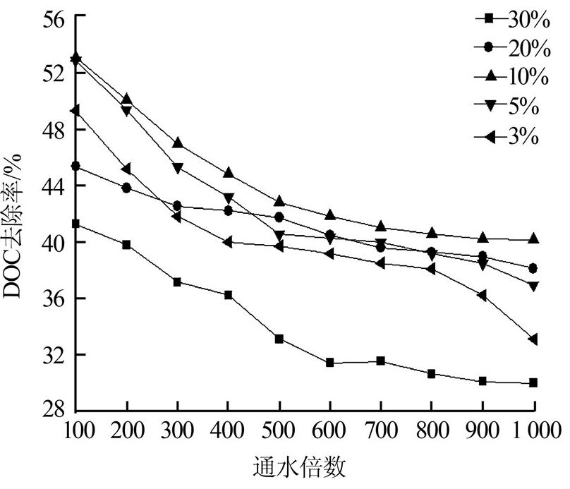 從圖 4可以看出,再生液質量分數過高或過低均會影響再生效果,當再生液質量分數為10%時DOC去除率最高,MIEX®表現出最好的處理效果;當再生液質量分數提高至30%時,再生效果最差;當再生液質量分數降至3%時,雖然通水倍數在100 BV時DOC去除率接近50%,但隨著通水倍數的增加DOC去除率下降明顯,在通水倍數達到1 000 BV時去除率已降至33%;再生液質量分數分別為5%、20%時,在通水倍數達到500 BV前,再生液質量分數較低者表現出較優的再生效果,通水倍數達到500 BV后,二者的DOC去除率接近。