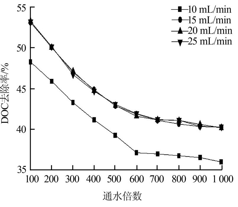 圖 2 反映了新鮮樹脂對DOC去除率隨通水倍數的變化規律。