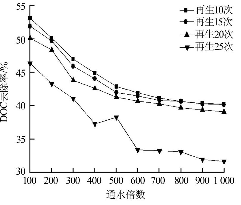 樹脂可再生批次是衡量樹脂性能及評判再生方法的一個重要因素。分析了動態逆流再生方式下,MIEX®經10次、15次、20次、25次再生處理后,對DOC去除率的變化規律,見圖 6。