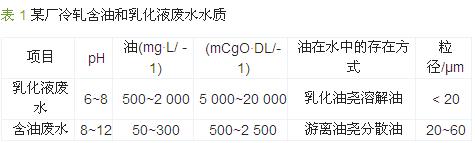 乳化液廢水的特點是水量小,水中的COD和油含量高,油在水中多呈現乳化狀態。含油廢水的特點是水量大,水溶液呈堿性,水中主要是游離油和分散油。含油廢水的來源不同,水中油污染物的成分和存在狀態也不同,將導致其處理方法不同。某廠冷軋含油和乳化液廢水的水質分析結果如表 1所示。