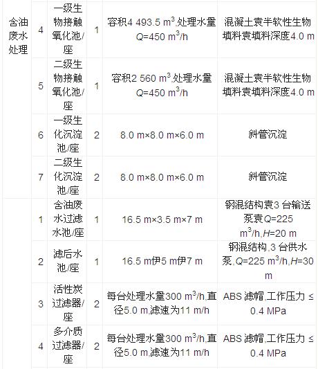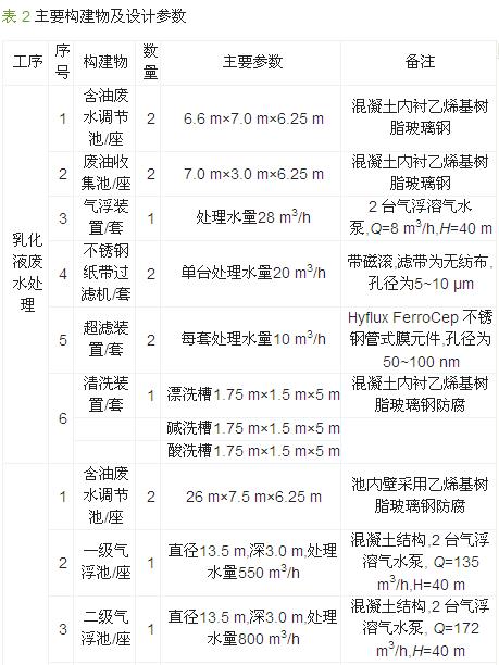 該廠產生的乳化液廢水水量為15 m3/h,含油廢水水量為450 m3/h,含油和乳化液廢水是主要處理對象。工藝主要構建物及參數如表 2所示。