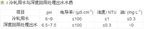 對比了冷軋用水與深度回用處理出水的水質,見表 4。不難看出,深度回用處理出水水質完全符合冷軋用水的水質要求。