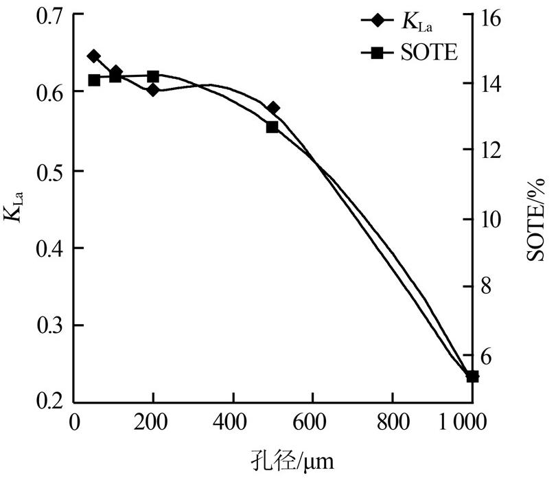 孔徑對氣泡的形成有很大影響,孔徑越大,氣泡的尺寸越大〔11〕。氣泡對充氧性能的影響主要表現在兩個方面:一是單個氣泡越小,整體氣泡的比表面積越大,氣液間傳質接觸面積越大,越有利于氧氣的轉移;二是氣泡越大,對水體的攪動作用越強,氣液之間混合越快,充氧效果越好。往往第一點在傳質過程中起主要作用。試驗將曝氣量設定為0.5 m3/h,考察孔徑對KLa和氧利用率的影響,見圖 4。