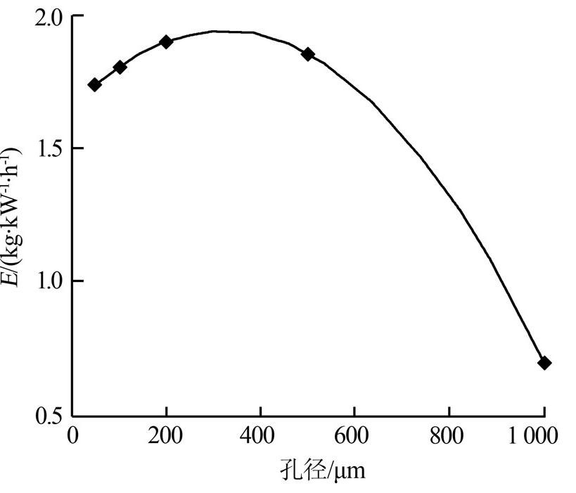 由圖 5可知,理論動力效率隨孔徑的增加呈先增大后減小的趨勢。這是因為一方面小孔徑曝氣器具有較大的KLa和充氧能力,有利于充氧的進行。另一方面,一定水深下阻力損失隨孔徑的減小而增大〔12〕。當孔徑減小對阻力損失的促進作用大于氧傳質作用時,理論動力效率就會隨孔徑的減小而降低。因此孔徑較小時理論動力效率會隨孔徑增大而增大,并于孔徑200 μm處達到最大值1.91 kg/(kW·h);當孔徑>200 μm時,阻力損失在曝氣過程中不再起主導作用,KLa和充氧能力會隨著曝氣器孔徑的增加而減小,因而理論動力效率呈明顯下降趨勢。