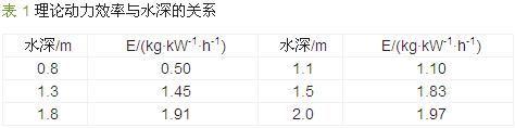 圖 6表明,隨著水深的增加,KLa和氧利用率均呈明顯的增大趨勢,KLa在水深0.8 m處和水深2 m處相差4倍多。這是因為水深越大,氣泡在水體中的停留時間越長,氣液接觸時間就越長,氧傳質效果越好。因此,曝氣器安裝越深越有利于充氧能力和氧利用率的提高。但安裝水深增加的同時阻力損失也會增加,為了克服阻力損失,就必須增加曝氣量,這勢必會導致能耗和運行成本的增加。因此,為了得到最佳安裝水深,有必要對理論動力效率與水深的關系進行評估,見表 1。