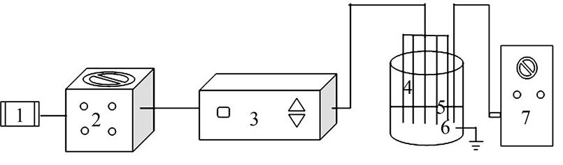 1—電源;2—調壓器;3—高壓交流電源;4—銅電極; 5—放電反應器;6—地線;7—空氣壓縮機。