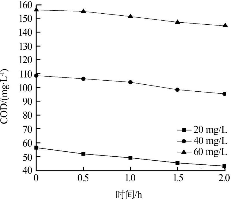 在放電功率為250 W、pH=5、曝氣量為100 mL/min的條件下分別對初始質量濃度為20、40、60 mg/L的DMP溶液降解2 h,每隔0.5 h取樣一次,測定其COD,研究DMP初始質量濃度對降解效果的影響,如圖 2所示。