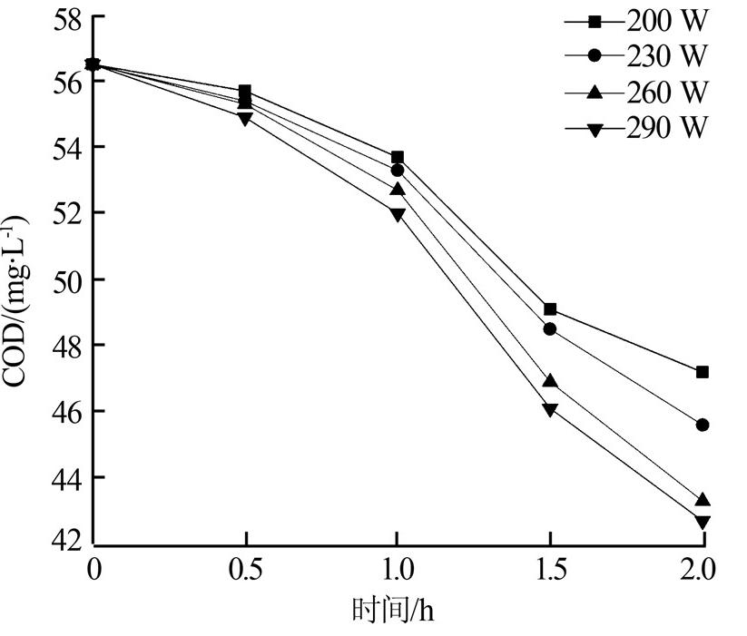 在曝氣量為100 mL/min、pH為5、放電功率分別為200、230、260、290 W的條件下對初始質量濃度為20 mg/L的DMP溶液降解2 h,每隔0.5 h取樣一次,測定其COD,研究放電功率對DMP降解效果的影響,如圖 3所示。