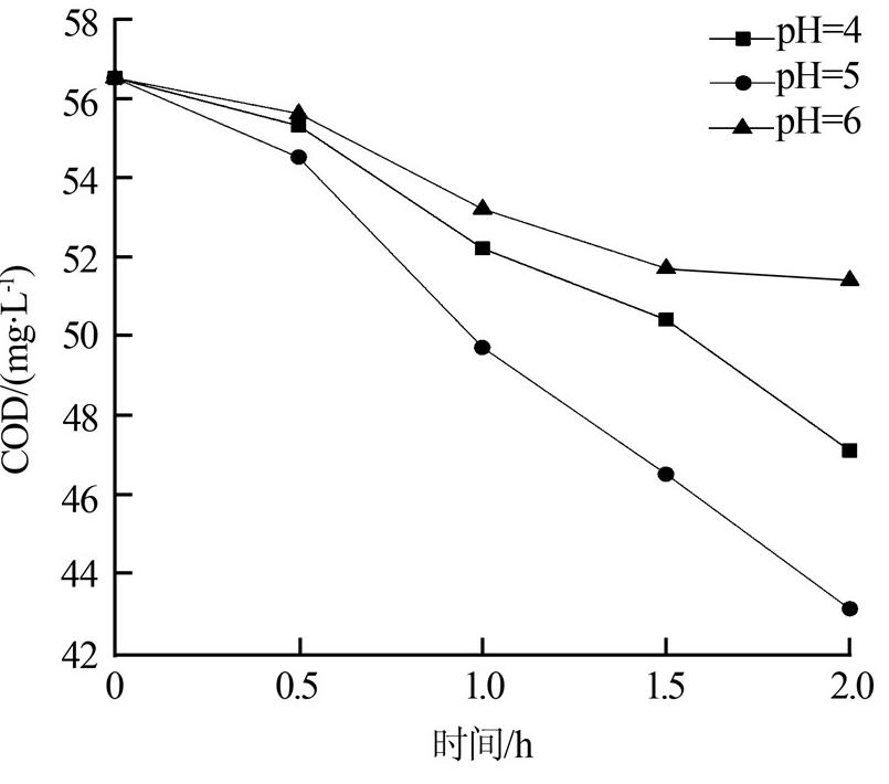 根據DMP易溶于酸而不溶于堿的性質,研究初始pH對DMP降解效果的影響。在放電功率為 260 W、初始質量濃度為20 mg/L、曝氣量為100 mL/min的條件下分別對初始pH為4、5、6的DMP溶液降解2 h,每隔0.5 h取樣一次,測定其COD,如圖 4所示。