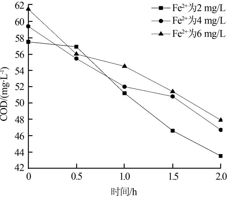但從圖 5可知,Fe2+在實驗體系中的催化作用并不明顯,COD的變化也不規律,此外Fe2+本身也會使溶液COD升高。可見Fe2+不適用于該實驗體系,催化劑的選擇有待深入研究。