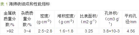 SB-5200D7超聲波清洗機,寧波新芝生物科技股份有限公司;UV-2450紫外可見分光光度計,日本島津公司;4k15高速離心機,西格瑪奧德里奇(上海)貿易有限公司;pHS-3C酸度儀,上海精科儀器有限公司。海綿鐵(性能見表 1),北京開碧源貿易有限責任公司;丹寧酸、腐殖酸鈉、酸性藍9,均為分析純,上海晶純生化科技股份有限公司;NaCl、Na2SO4、NaNO3、Na2CO3、Na3PO4·12H2O、CaCl2·2H2O、MgCl2·6H2O、KCl、ZnCl2均為分析純,購自天津大茂化學試劑廠;實驗用水為超純水(比電阻18.2 MΩ·cm,Milli-Q超純水系統)。