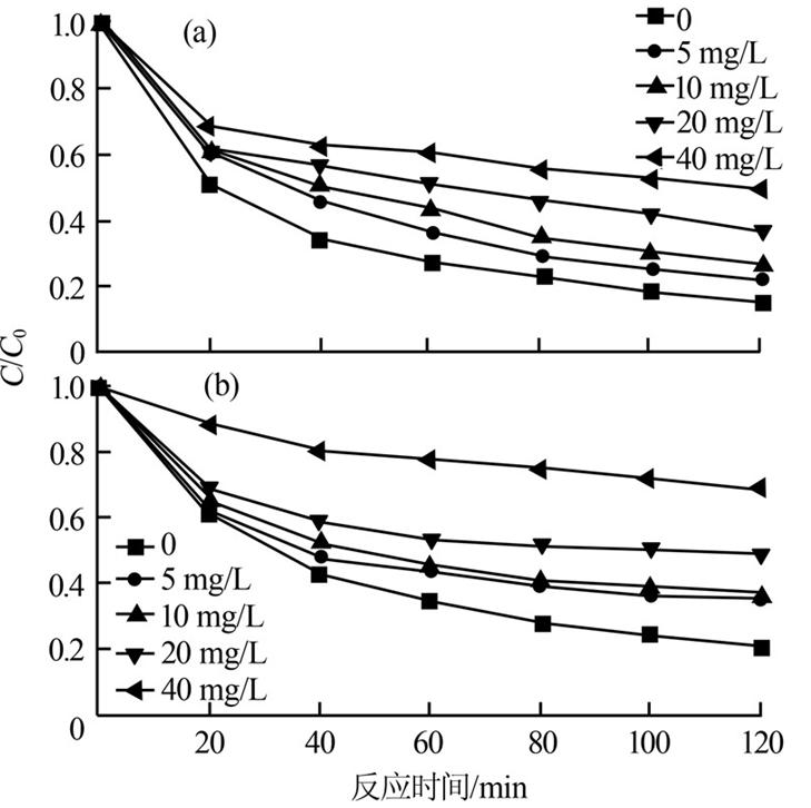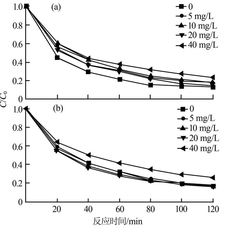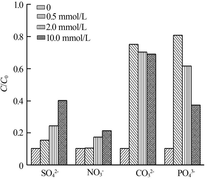 考察了4種水體中常見陰離子對海綿鐵降解AB9效果的影響,SO42-、NO3-、CO32-和PO43-在不同濃度下對海綿鐵降解AB9的效果均有抑制作用,SO42-和NO3-濃度越大,抑制越明顯,而CO32-和PO43-對海綿鐵降解AB9有強烈的抑制作用,隨離子濃度增大抑制作用呈逐漸減弱趨勢。4種離子對海綿鐵降解AB9的抑制作用強弱為PO43->CO32->SO42->NO3-,結果如圖 4所示。