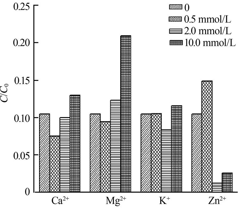 考察了4種水體中常見陽離子對海綿鐵降解AB9效果的影響,其中Ca2+和Mg2+為常見硬度離子,K+為常見一價離子,Zn2+代表微量金屬離子,4種離子的影響結果如圖 5所示。