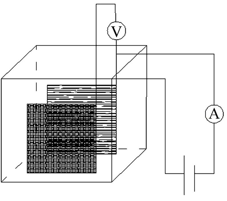 實驗選用Ir-Ta-Sn摻雜電極(購自寶雞智銘特種金屬有限公司)作陽極,不銹鋼電極作陰極,構成電催化降解實驗裝置。裝置尺寸為 160 mm×150 mm×70 mm,外接可調電源,如圖 1所示。