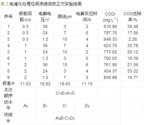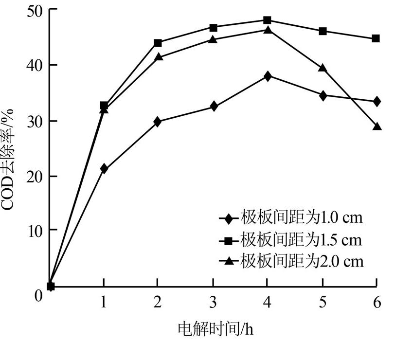 (3)調節極板間距至1.5~2.0 cm對提高垃圾滲濾液的COD去除率有利。過小的極板間距會產生短路現象,過大則會降低去除效果。