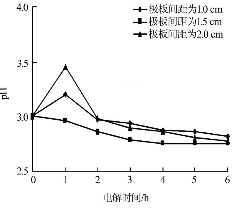 考慮到過高的電解電壓對電催化降解的影響不是很顯著,且由正交實驗結果可知,電解電壓為24 V、pH為3時COD去除率最高,因此調整電解電壓為24 V、垃圾滲濾液pH為3,分別設置極板間距為1.0、1.5、2.0 cm進行電催化降解實驗,每隔1 h取1次水樣,電解過程中COD去除率及pH變化情況如圖 5、圖 6所示。