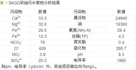 由于受到原油中膠質、瀝青質、驅油劑以及地層天然顆粒物等影響,油田采油污水的水質各異且比較復雜,處理難度較大,回注效率低。對SAGD采油污水進行了常規的水質分析,充分了解油田采油污水的水質特性,見表 1。