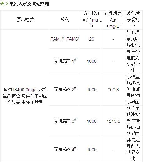 (1)破乳劑的篩選。因SAGD采油污水乳化穩定性較強,試驗選取PAM1#~PAM6# 以及無機藥劑1#~4#來篩選破乳劑。在破乳溫度為65 ℃、停留時間為1 h時,根據水樣表觀特征及部分試驗數據選擇高效藥劑,結果如表 3所示。