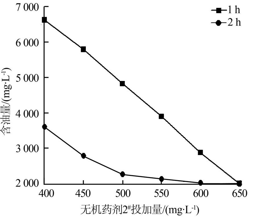當停留時間為2 h、無機藥劑2#投加量為500 mg/L時,處理后水樣含油可降至2 258.6 mg/L,與停留時間為1 h、藥劑投加量為650 mg/L的破乳效果相當,如圖 2所示。當停留時間為2 h,藥劑投加量<500 mg/L時,破乳后水樣含油量上升迅速。為減少藥劑的用量,最優選擇為無機藥劑2#、停留時間為2 h。