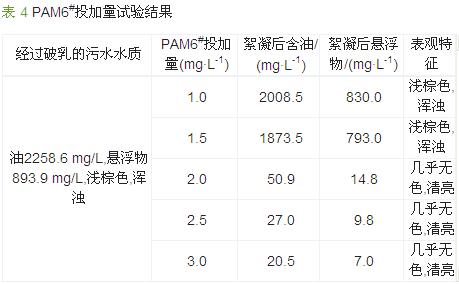 由表 4可見,當PAM6#投加量在2 mg/L以下時,絮凝效果一般;投加量達到2 mg/L后,水樣絮凝效果明顯,小油珠及懸浮物迅速上浮,水樣變得清亮;當投加量達到2.5 mg/L時,絮凝后水樣含油27.0 mg/L,懸浮物為9.8 mg/L,根據油田采油污水回注水控制標準(懸浮固體 < 10.0 mg/L,油 < 30 mg/L),達到了油田回注水的水質標準要求。具體參見http://www.bnynw.com更多相關技術文檔。